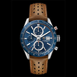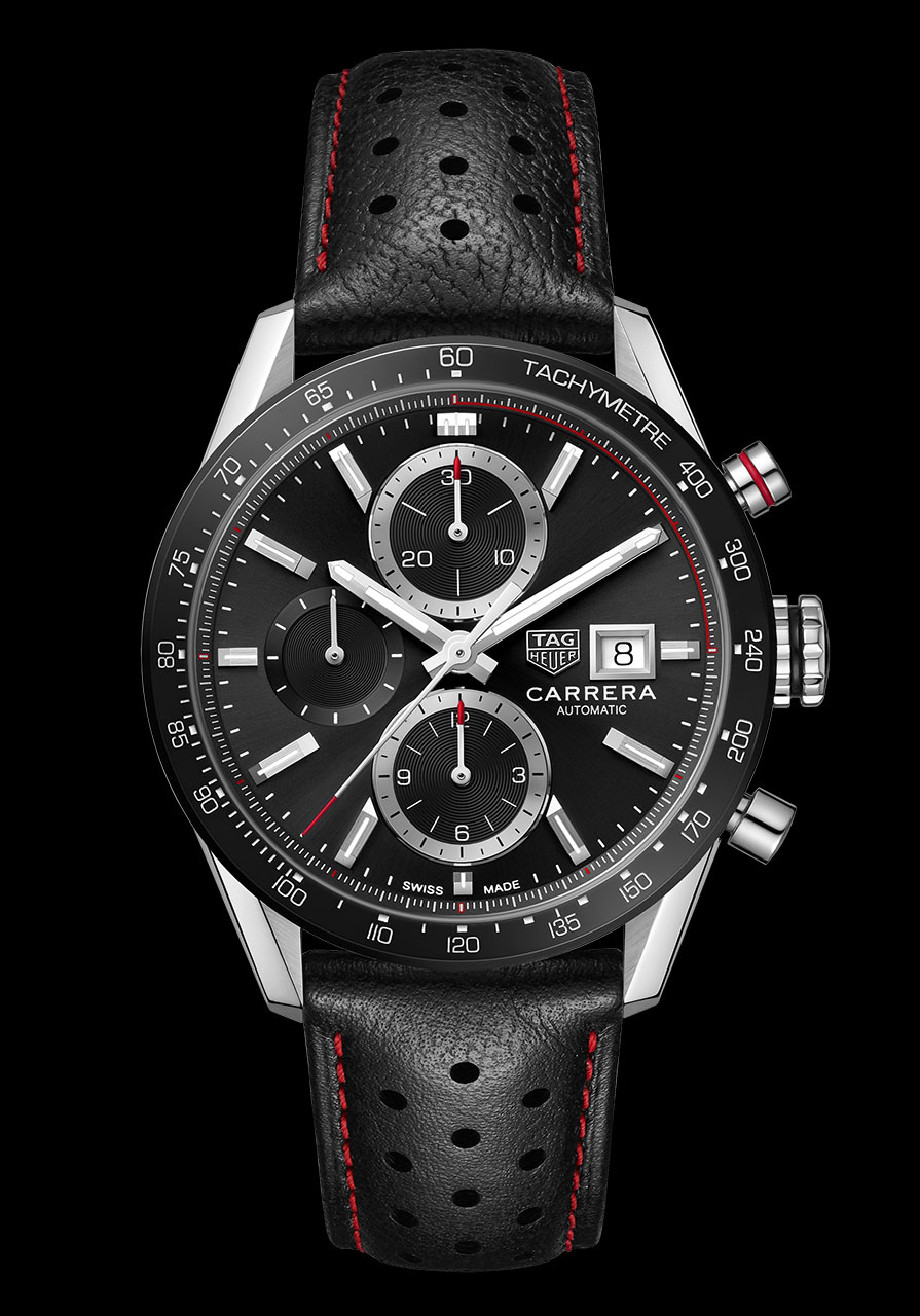 Самая запоминающаяся из четырех новых моделей — синие часы со светло-коричневым кожаным ремешком. Новые TAG Heuer Carrera представлены на перфорированном ремешке из телячьей кожи, а внутренняя сторона ремешка выполнена в оранжевом оттенке. В таком же цветовом решении отмечены и акценты на циферблате. Модель также представлена с синим циферблатом на браслете из нержавеющей стали. Коллекцию дополнили часы с черным циферблатом на браслете из нержавеющей стали и на ремешке из черной кожи с красной прострочкой.