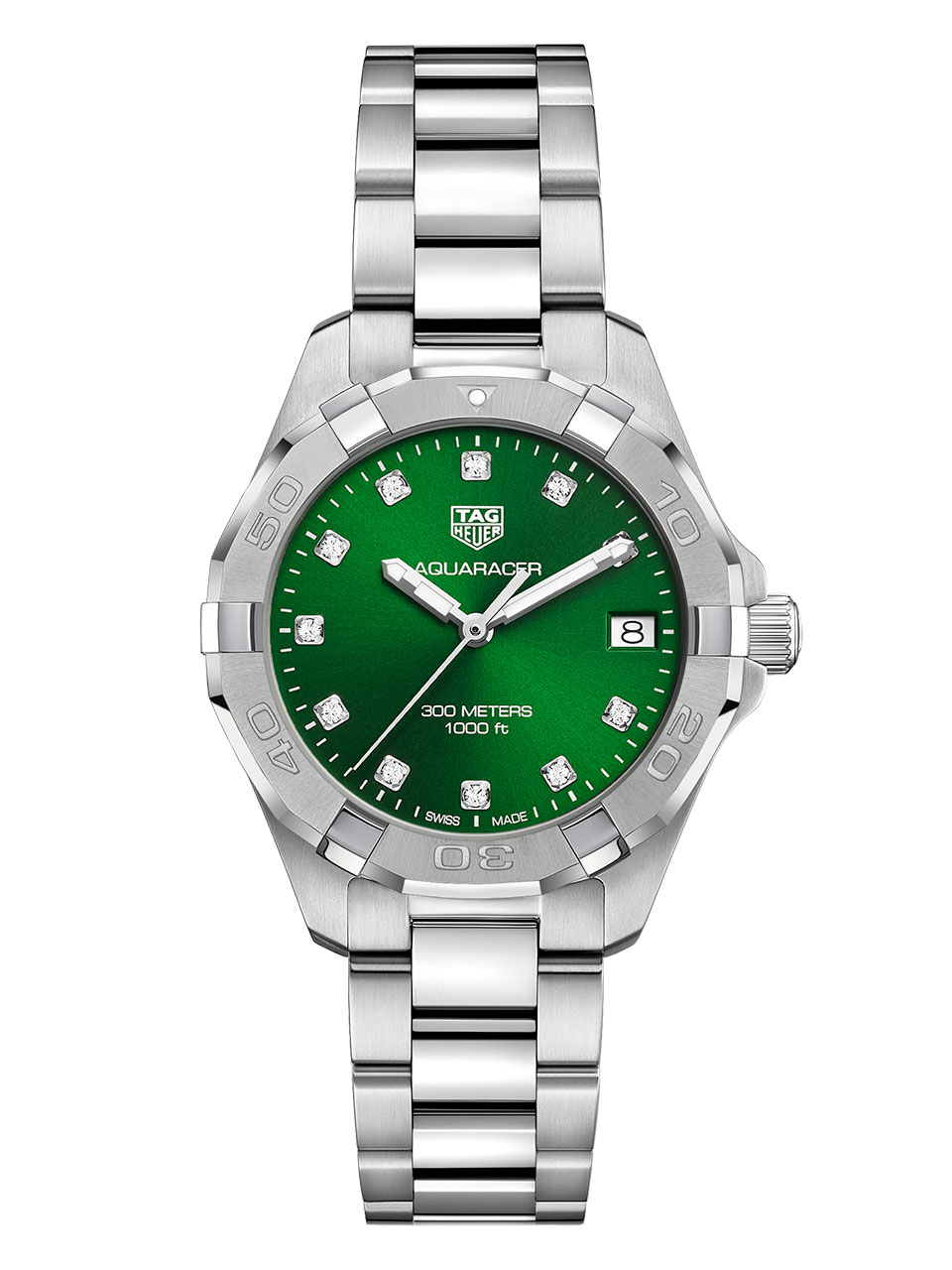 Модель Aquaracer с корпусом диаметром 43 мм имеет уникальный зеленый циферблат с эффектом sunray. Горизонтальные линии, украшающие циферблат, напоминают деревянный причал, вдоль которого мерно качаются парусники. На циферблате есть указатель даты, а индексы, безель и треугольный указатель на отметке «12 часов» покрыты черным лаком. Модель женской коллекции с корпусом диаметром 32 мм обладает таким же ярким циферблатом, а ее индексы украшены бриллиантами. На циферблате также есть указатель даты и треугольный указатель на отметке «12 часов» для оптимальной считываемости времени. Корпус и ремешок новых Aquaracer выполнен из нержавеющей стали. Мужская модель с корпусом 43 мм оснащена автоматическим механизмом Calibre 5, а женская модель обладает кварцевым механизмом.