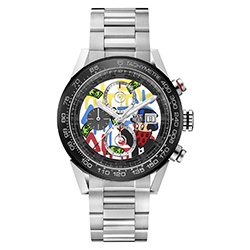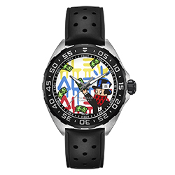 Новые модели TAG Heuer Formula 1 и Carrera получились оригинальными и яркими благодаря изображенному на циферблате маленькому банкиру по имени Monopi с красной банданой, прикрывающей лицо. Он разбрасывает денежные банкноты на фоне легко узнаваемой подписи Алека Монополи, которая выполнена в желтом, голубом и красном цветах. Модель Formula 1 диаметром 41 мм дополнена черным каучуковым ремешком. Спортивные часы имеют однонаправленный безель из нержавеющей стали с черным PVD-покрытием и выгравированной 60-минутной шкалой. Темный дизайн часов стал идеальным фоном для ярких изображений на циферблате.