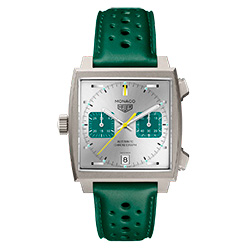 Каждый элемент дизайна Monaco Chronograph Racing Green вдохновлён историческими болидами, а серебристый циферблат с солнечной шлифовкой напоминает приборные панели спортивных автомобилей 1920–1930-х годов. Детали в белых и жёлтых оттенках перекликаются с традиционной британской гоночной эстетикой.