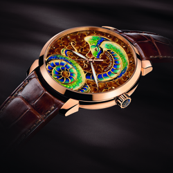 Как известно, в древней китайской мифологии эта рептилия относится к роду божественных, благородных и мудрых существ. На циферблате новых часов образ благородной и мудрой змеи запечатлён в виде цветного изображения, выполненного в технике выемчатой эмали – «champlevé» – древнего, почти утраченного способа нанесения прочного цветного рисунка на ювелирные изделия из металла.
