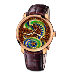 Новинка представляет собой яркое и необычное явление для часовой индустрии. Часы интересны, прежде всего, художественным исполнением циферблата на котором изображена змея – символ наступившего 2013 года (года водяной змеи согласно китайскому календарю) и шестой по счёту знак в 12-летнем цикле восточного зодиака.