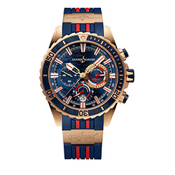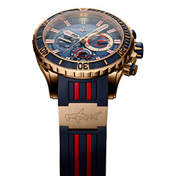 1. Ulysse Nardin Diver Chronograph Hammerhead Shark Limited edition 1502-151LE-3/93-Hammer. Ограниченная серия в количестве 99 экземпляров. Корпус, безель, заводная головка, пушеры, центральные стрелки, условные часовые индексы, декоративные вставки на ремешке и застёжка – из 18-каратного розового золота. Тёмно-синий циферблат и синий каучуковый ремешок. |