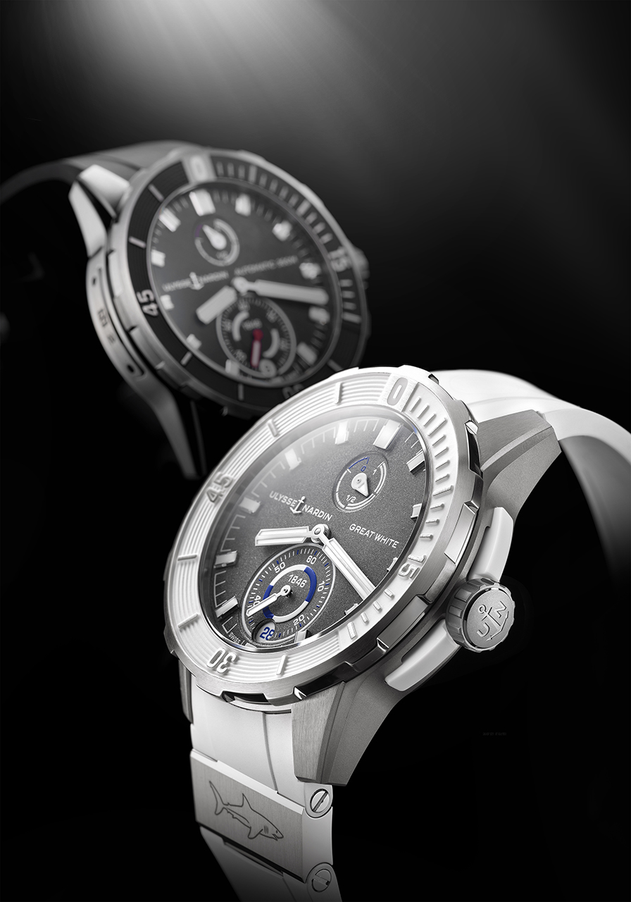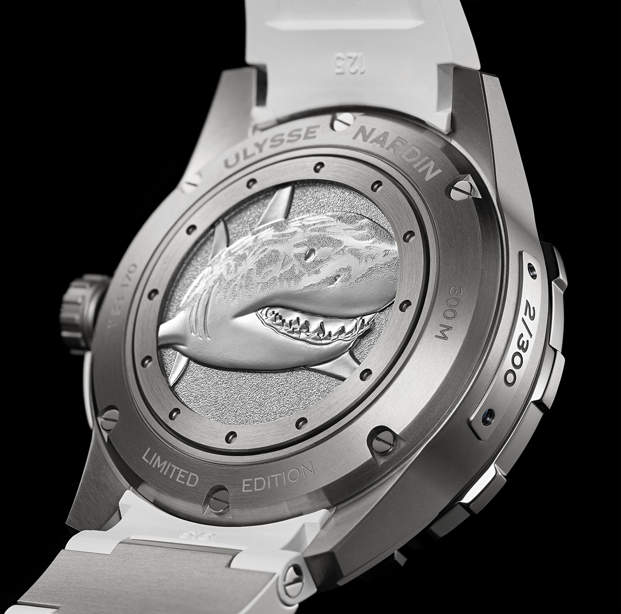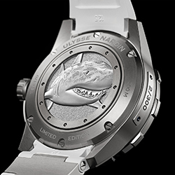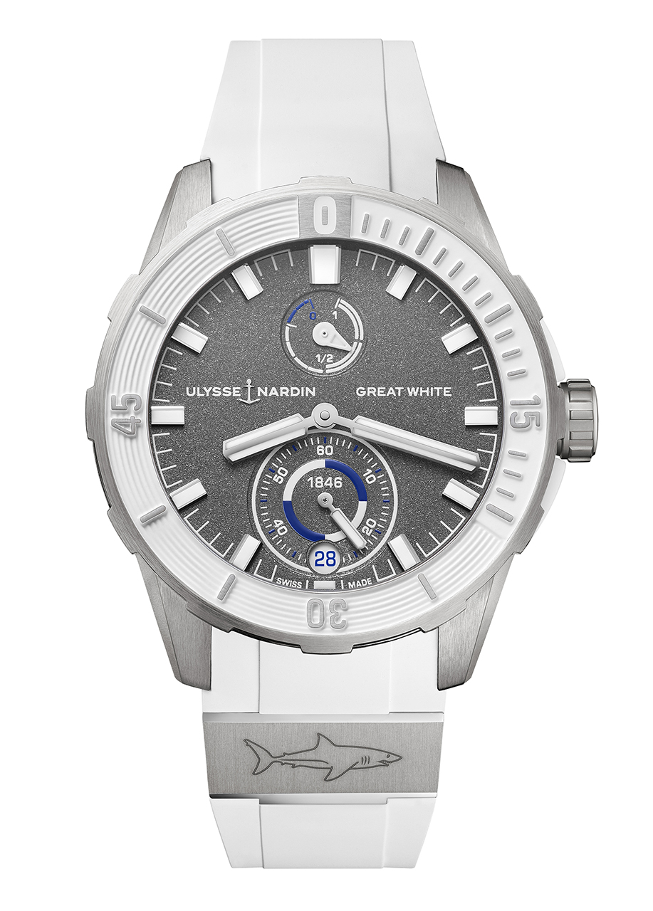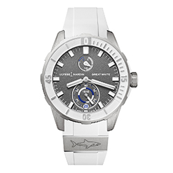 Модель Diver Great White украшает оттиск большой белой акулы на задней крышке. Главный морской хищник – мощный, умный, быстрый – как символ философии Ulysse Nardin. Лимитированная коллекция представлена в количестве 300 экземпляров. Часы Diver Great White готовы к встрече с неизвестным.