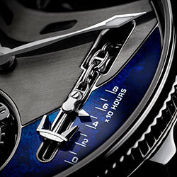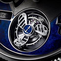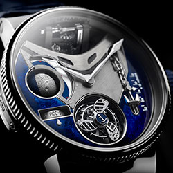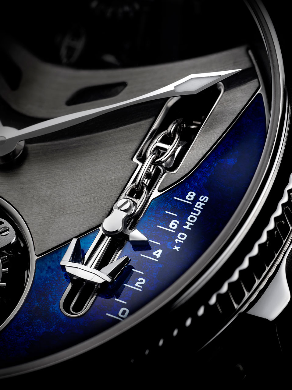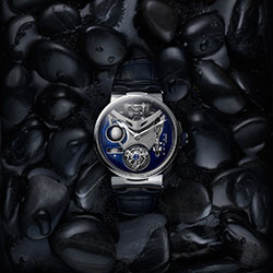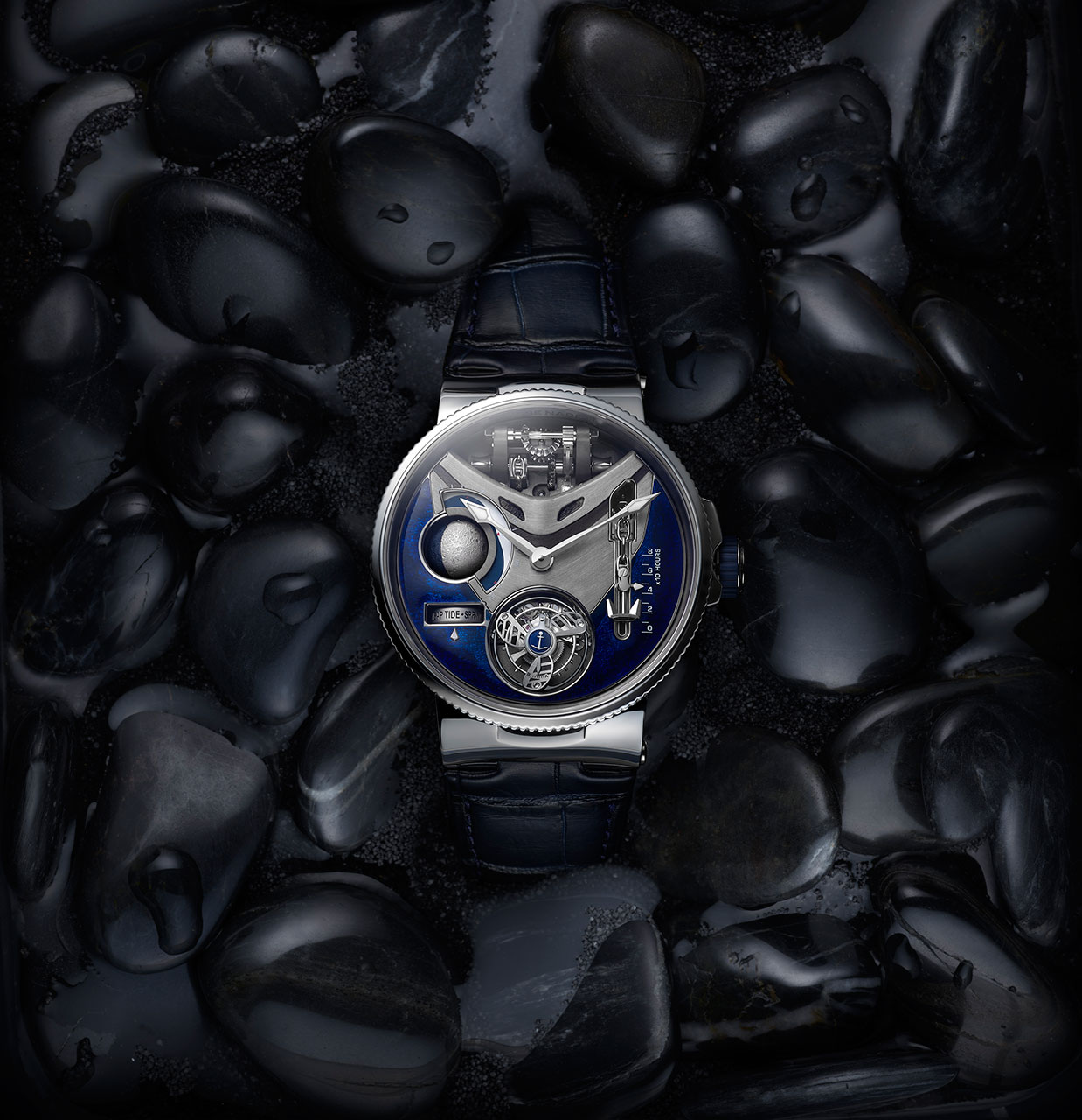Парящий турбийон выполнен в форме гребного винта последнего поколения. Трехмерный эмалевый циферблат в технике горячей эмали grand feu напоминает нос корабля, прорезающего волны. Точное отображение фаз Луны и детальное изображение структуры ее поверхности расположено на отметке «девять» часов рядом с указателем приливов и отливов. Напротив – индикатор запаса хода, выполненный в форме якорной цепи, который поднимается и опускается по принципу канатной лебедки – в зависимости от времени, оставшегося до подзавода.