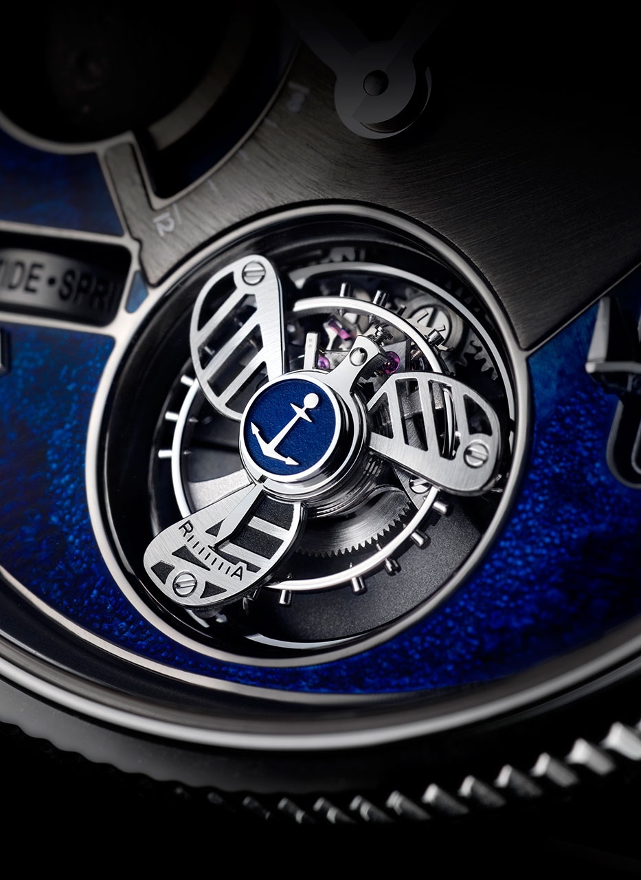 «Двигатель» диаметром 37 мм состоит из 504 отдельных деталей и компонентов, имеет ручной завод. Гарантированный запас хода составляет 80 часов на крейсерской скорости 21,600 полуколебаний в час, турбийон движется со скоростью 60 оборотов в час или один оборот каждые 60 секунд. Одна из главных задач – максимально корректное отображение положения Луны по отношению к Земле на циферблате для точного определения приливов и отливов. Система содержит механизм, отвечающий за функцию отображения высоты уровня моря в реальном времени по отношению к конкретному месту, а также учитывает сезонные коэффициенты. Прилив – важный аспект прибрежной навигации. Как только механизм отрегулирован при помощи заводной головки, корректное отображение показателей происходит в окошке на корпусе – рядом с заводной головкой. Это осуществляется аналогичным способом, как исторически отображалось на традиционном машинном телеграфе английской системы Чадборна. Не забывая о том, что производственный процесс часовой механики – это тоже искусство, якорь на циферблате имеет современный дизайн, а его лапы (острые наконечники) – выполненный в форме сошника. Он соединен с цепью специальной скобой и составляет единую систему: якорная цепь движется в такт поворотам заводной головки и отвечает за отображение запаса хода. Стараясь максимально реалистично передать работу механизма, мануфактура использует миниатюрную копию брашпиля (палубного механизма лебедочного типа), расположенного на отметке 12 часов. При помощи колесной передачи, объединенной с механизмом намотки, лебедка вращается, имитируя тем самым подъем якоря, даже когда запас хода полон.