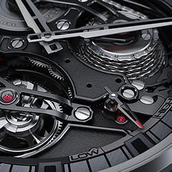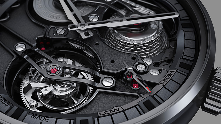 Полностью скелетонированный циферблат позволяет пристально рассмотреть оригинальную архитектуру механизма «El Primero 4805», имеющего сатинированные платину и мосты с пескоструйной обработкой и тёмно-серым покрытием, скошенными краями и полированными винтами, а также два традиционных мануфактурных усложнения. К ним, как уже было сказано, относятся – минутный турбийон, установленный чуть выше отметки «6 часов», и фузейно-цепная передача (спиралевидный конус фузеи, цепь и заводной барабан), помещённая в пространстве между отметками «10 часов 30 минут» и «1 час 30 минут». Сам циферблат представлен центральными прямоугольными частично скелетонированными фацетированными4 стрелками часов и минут с рутениевой5 отделкой и чёрным люминесцентным покрытием «Superluminova», а также вынесенными на фланец условными часовыми чёрными люминесцирующими индексами. Кроме того, в структуру циферблата входит стрелочный индикатор 50-часового запаса хода, расположенный напротив отметки «4 часа», шкала которого, с индексами «High» и «Low», помещена на фланец между отметками «3 и 5 часов».