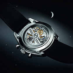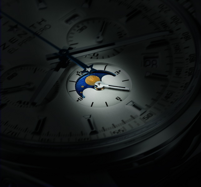 Помимо традиционных опций на циферблате расположены индикаторы месяца и дня недели у отметок «10 часов» и «2 часа» соответственно, указатель даты – между отметками «4 часа» и «5 часов». Также на циферблате установлены: 12-часовой счётчик напротив отметки «6 часов», 30-минутный счётчик напротив отметки «3 часа» и 60-секундный счётчик у отметки «9 часов». Счётчики украшены спиралевидным узором, контрастирующим с отделкой серебристого циферблата. Самый же привлекательный и сложный элемент циферблата – указатель лунных фаз, удачно интегрирован в циферблат 12-часового счётчика. Луна двигается в окошке оригинальной формы с двумя округленными выступами, символизирующими тёмную сторону спутника Земли в течение полного лунного цикла (растущая луна, полнолуние, убывающая луна, новолуние). Диск с отображением двух Лун приводит в движение колесо, насчитывающее 59 зубцов, соответствующих количеству дней в двух циклах (2 раза по 29,5 дней). Такое своеобразное решение наглядно демонстрирует техническое и эстетическое совершенство указателя. Несмотря на то, что сложные по исполнению функции калибра «Zenith El Primero 410» являются классическими, в таком сочетании они являются всё же редкостью в наше время.