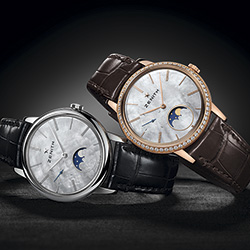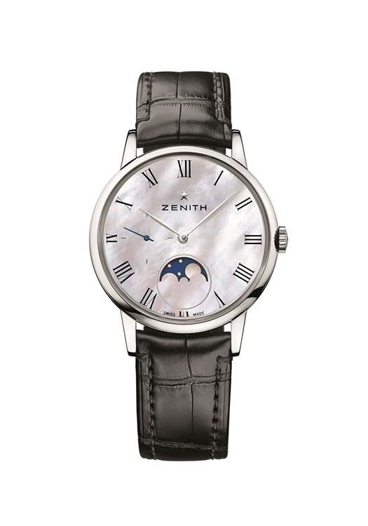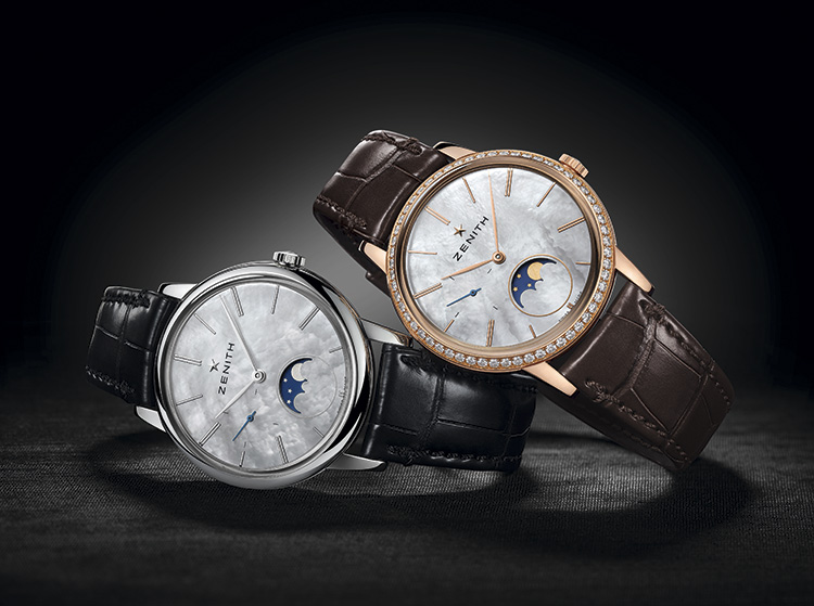 Новинка представлена пятью альтернативными по материалам изготовления и отделке моделями, при создании которых использовались нержавеющая сталь, розовое золото 750-й пробы, перламутр, а в качестве усложнения был выбран указатель лунных фаз. Все пять моделей демонстрируют образцовое сочетание лаконичных форм, свободных плавных линий и высочайшего технического и художественного мастерства преподнося, тем самым, образец истинной женственности в понимании марки «Zenith».
